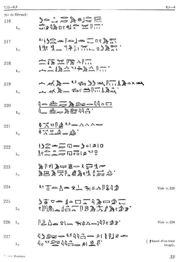 Hieroglyphic text of the Maxims of Good Discourse In 1956, Zába realized a decisive translation and also reproduced the hieroglyphs of the four main sources in a comprehensive and clear way (which was absent in the work of Dévaud, 1916). These hieroglyphs were published more than 40 years ago by the "Academie Tchécoslovatique des Sciences" of Prague (under the academician Frantisek Lexa), i.e. in former Czechoslovakia. They are identical with those published by him in 1948 in his thesis : Les Maximes de Ptahhotep, Texte, Traduction et Commentaires. |